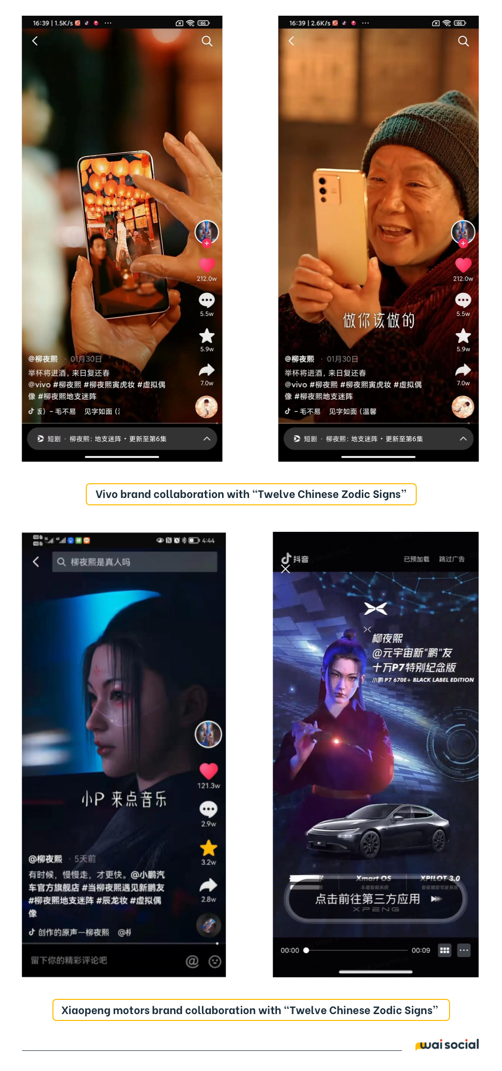 Domestic brands like Vivo mobile phones and Xiaopeng motors took the lead in collaborations with the show. Product placements were revealed in the plot, and the brands also cooperated with the virtual idol in subsequent series. Their official accounts interacted with each other on Douyin and generated traffic in the millions.