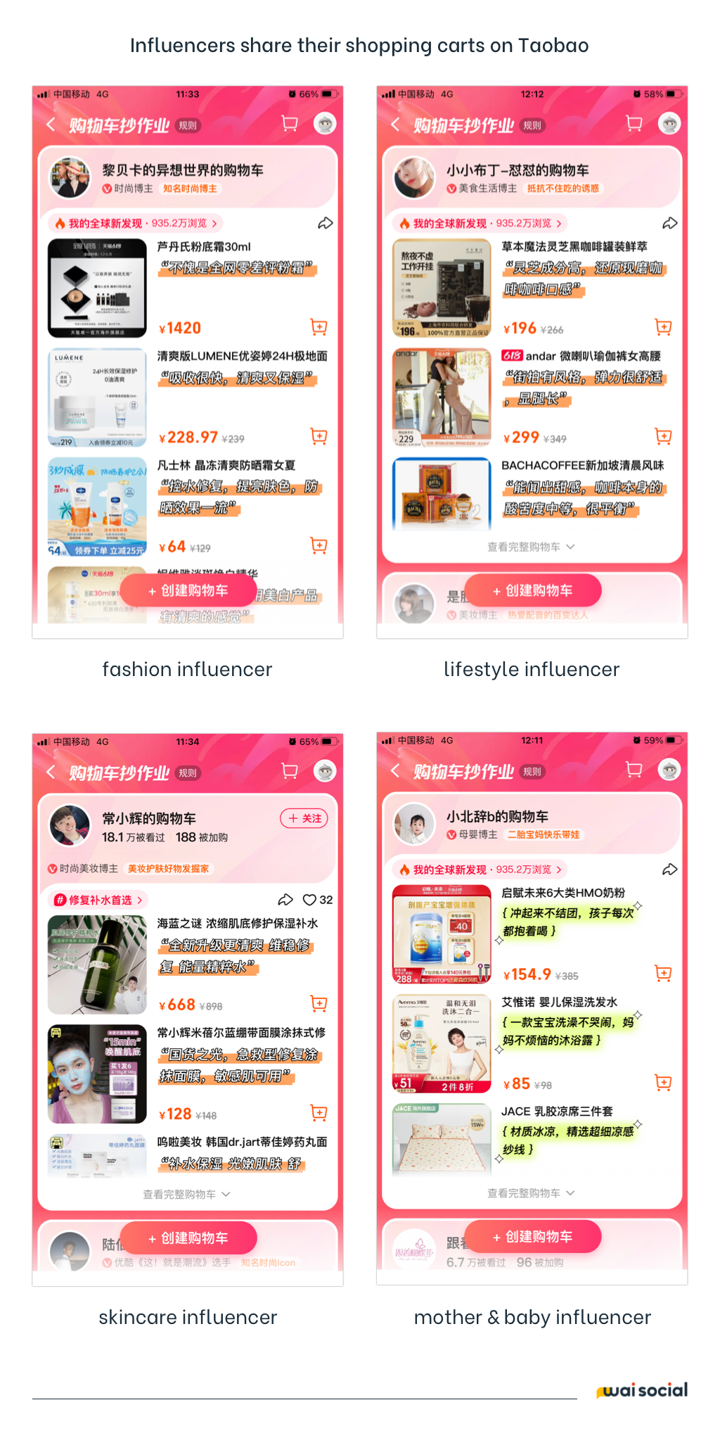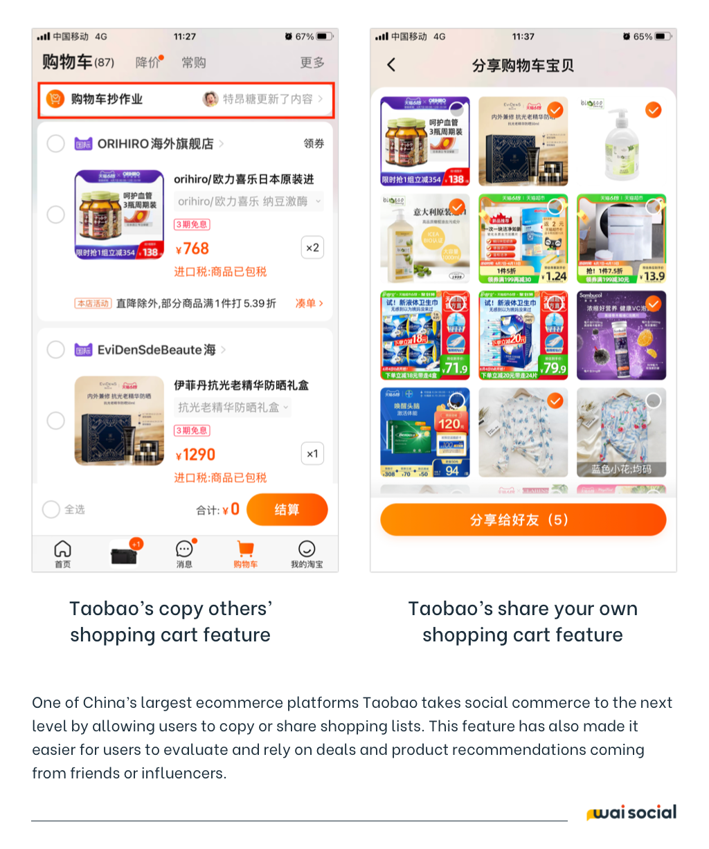 Users can easily check what other people (especially influencers and celebrities) are buying and purchase the same items, and also share the link of their own shopping cart to friends through WeChat, Weibo, or inner messages on Taobao platform.