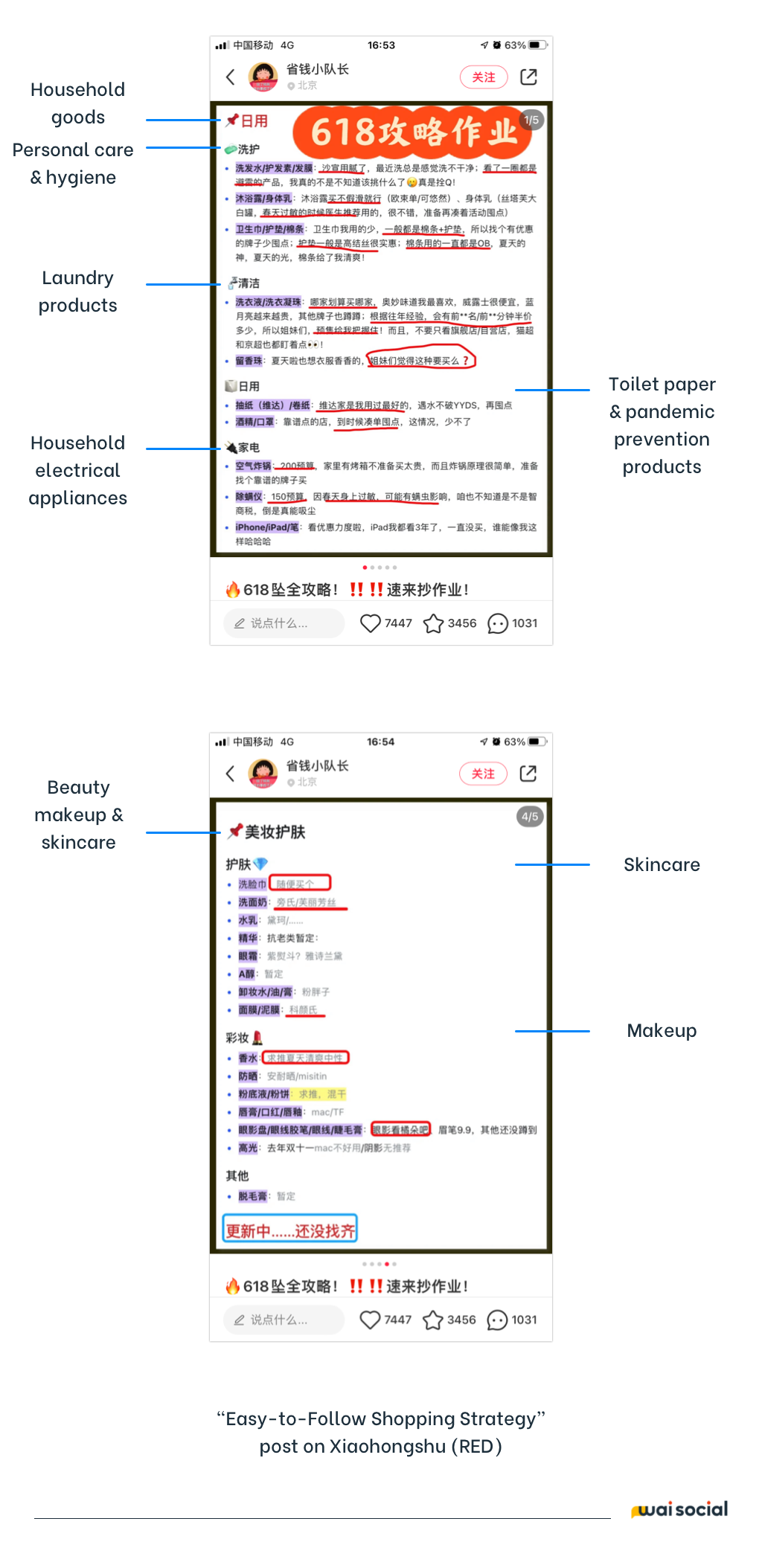 During this year's 618 period (one of China’s largest online shopping festivals), an article called “Easy-to-Follow Shopping Strategy” (可“抄作业”的购物攻略) listed recommendations and price ranges for different product categories in detail received more than 7,000 likes and 1,000 comments on Xiaohongshu.